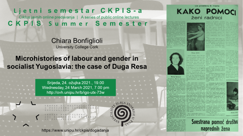 Druga gošća Ljetnog semestra CKPIS-a je Chiara Bonfiglioli, predavačica rodnih i ženskih studija na Sveučilišnom koledžu Cork u Irskoj, autorica knjige „Women and Industry in the Balkans: The Rise and Fall of the Yugoslav Textile Sector“ te suradnica CKPIS-a i  projekta Mikrosocijalizam (HRZZ). Na predavanju će govoriti o vrijednosti arhivskih izvora za mikrohistoriju rada i roda na primjeru djelovanja Konferencije za društvenu aktivnost žena (KDAŽ) u Dugoj Resi, tamošnjoj industriji i općinskim tijelima od šezdesetih godina nadalje.