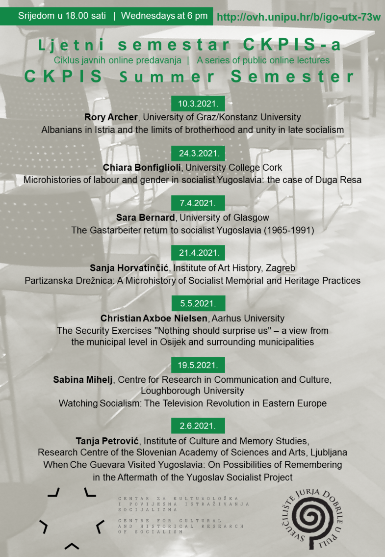 Od ožujka do lipnja 2021. u ciklusu online predavanja Ljetni semestar CKPIS-a održano je sedam predavanja. Naši gosti bili su Rory Archer (Albanians in Istria and the limits of brotherhood and unity in late socialism​), Chiara Bonfiglioli (Microhistories of labour and gender in socialist Yugoslavia: the case of Duga Resa), Sara Bernard (The Gastarbeiter return to socialist Yugoslavia), Sanja Horvatinčić (Partizanska Drežnica: A Microhistory of Socialist Memorial and Heritage Practices), Christian Axboe Nielsen (The Security Exercises "Nothing should surprise us" – a view from the municipal level in Osijek and surrounding municipalities), Sabina Mihelj (Watching Socialism: The Television Revolution in Eastern Europe) i Tanja Petrović (When Che Guevara Visited Yugoslavia: On Possibilities of Remembering in the Aftermath of the Yugoslav Socialist Project). Zajedno s programom u zimskom semestru ukupno je održano četrnaest predavanja. Hvala svim predavačima i publici!