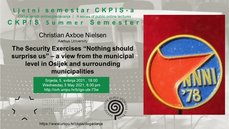 Prvi svibanjski gost Ljetnog semestra CKPIS-a je Christian Axboe Nielsen, izvanredni profesor na Sveučilištu u Aarhusu u Danskoj, autor monografija Making Yugoslavs: Identity in King Aleksandar’s Yugoslavia (2014) i Yugoslavia and Political Assassinations: The History and Legacy of Tito’s Campaign Against the Émigrés (2020). Na predavanju će predstaviti dio svojeg istraživanja na projektu Mikrosocijalizam (HRZZ), unutar kojega radi na temama državne i javne sigurnosti, uključujući i ondašnji sustav općenarodne obrane i društvene samozaštite.