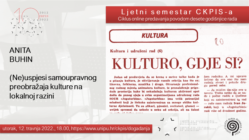 U ciklusu online predavanja Ljetni semestar CKPIS-a treća tema nosi naslov (Ne)uspjesi samoupravnog preobražaja kulture na lokalnoj razini i o njoj će govoriti Anita Buhin, naslovna poslijedoktorandica na pulskom sveučilištu i suradnica na projektu Mikrosocijalizam. Predavanje će se održati u utorak, 12. travnja 2022., u 18.00 sati u virtualnoj dvorani https://ovh.unipu.hr/b/and-gdp-arf.