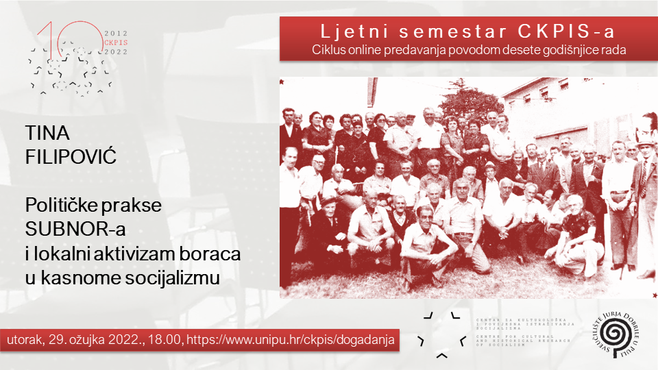 Druga su tema Ljetnog semestra CKPIS-a, ciklusa online predavanja kojim se ove godine obilježava deseta godišnjica rada Centra, Političke prakse SUBNOR-a i lokalni aktivizam boraca u kasnome socijalizmu, o čemu će govoriti Tina Filipović, doktorandica na projektu Mikrosocijalizam. Predavanje će se održati u utorak, 29. ožujka 2022., u 18.00 sati u virtualnoj dvorani https://ovh.unipu.hr/b/and-gdp-arf.