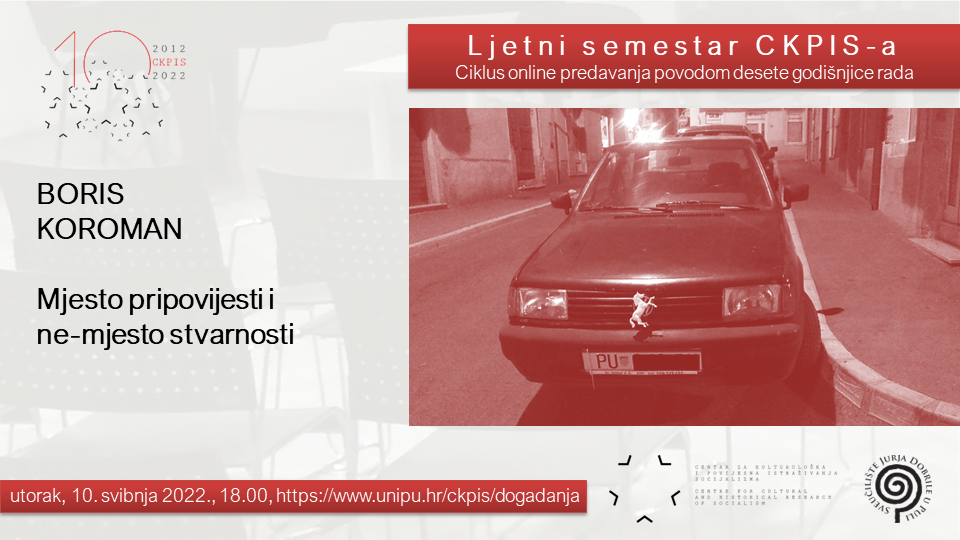 U ovogodišnjem Ljetnom semestru CKPIS-a, ciklusu predavanja povodom desete godišnjice Centra, peti je predavač Boris Koroman s temom Mjesto pripovijesti i ne-mjesto stvarnosti. Predavanje će se održati u utorak, 10. svibnja 2022., u 18.00 sati u virtualnoj dvorani https://ovh.unipu.hr/b/lad-fcf-rpe-ydv.