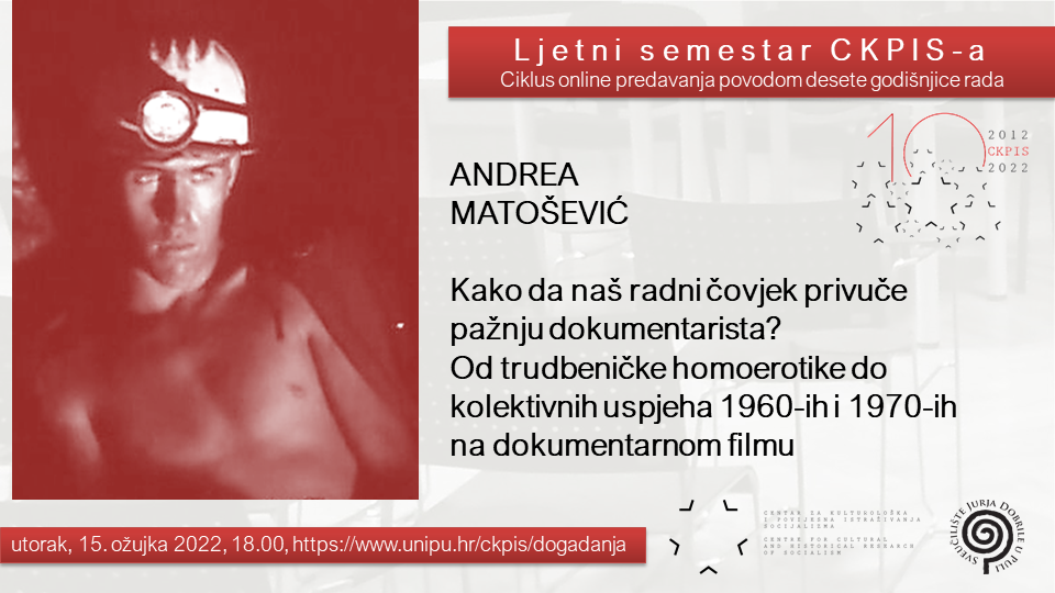 Ciklus online predavanja Ljetni semestar CKPIS-a, kojim se ove godine obilježava deseta godišnjica rada Centra, otvara Andrea Matošević s temom Kako da naš radni čovjek privuče pažnju dokumentarista? Od trudbeničke homoerotike do kolektivnih uspjeha 1960-ih i 1970-ih na dokumentarnom filmu. Predavanje će se održati u utorak, 15. ožujka 2022., u 18.00 sati u virtualnoj dvorani https://ovh.unipu.hr/b/and-gdp-arf.