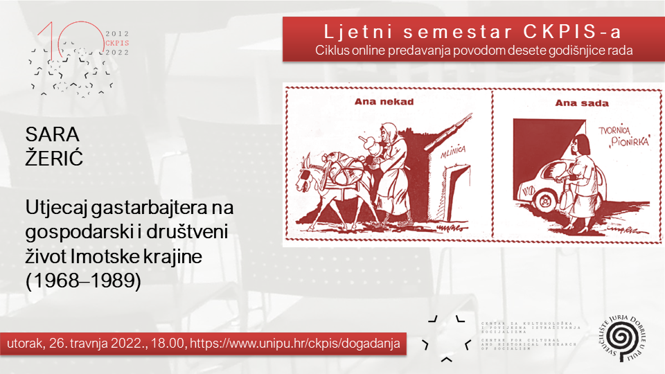 Najmlađa suradnica CKPIS-a Sara Žerić, doktorandica na Sveučilištu u Regensburgu, u ciklusu Ljetni semestar CKPIS-a nastupa s temom Utjecaj gastarbajtera na gospodarski i društveni život Imotske krajine (1968–1989). Predavanje će se održati u utorak, 26. travnja 2022., u 18.00 sati u virtualnoj dvorani https://ovh.unipu.hr/b/and-gdp-arf.