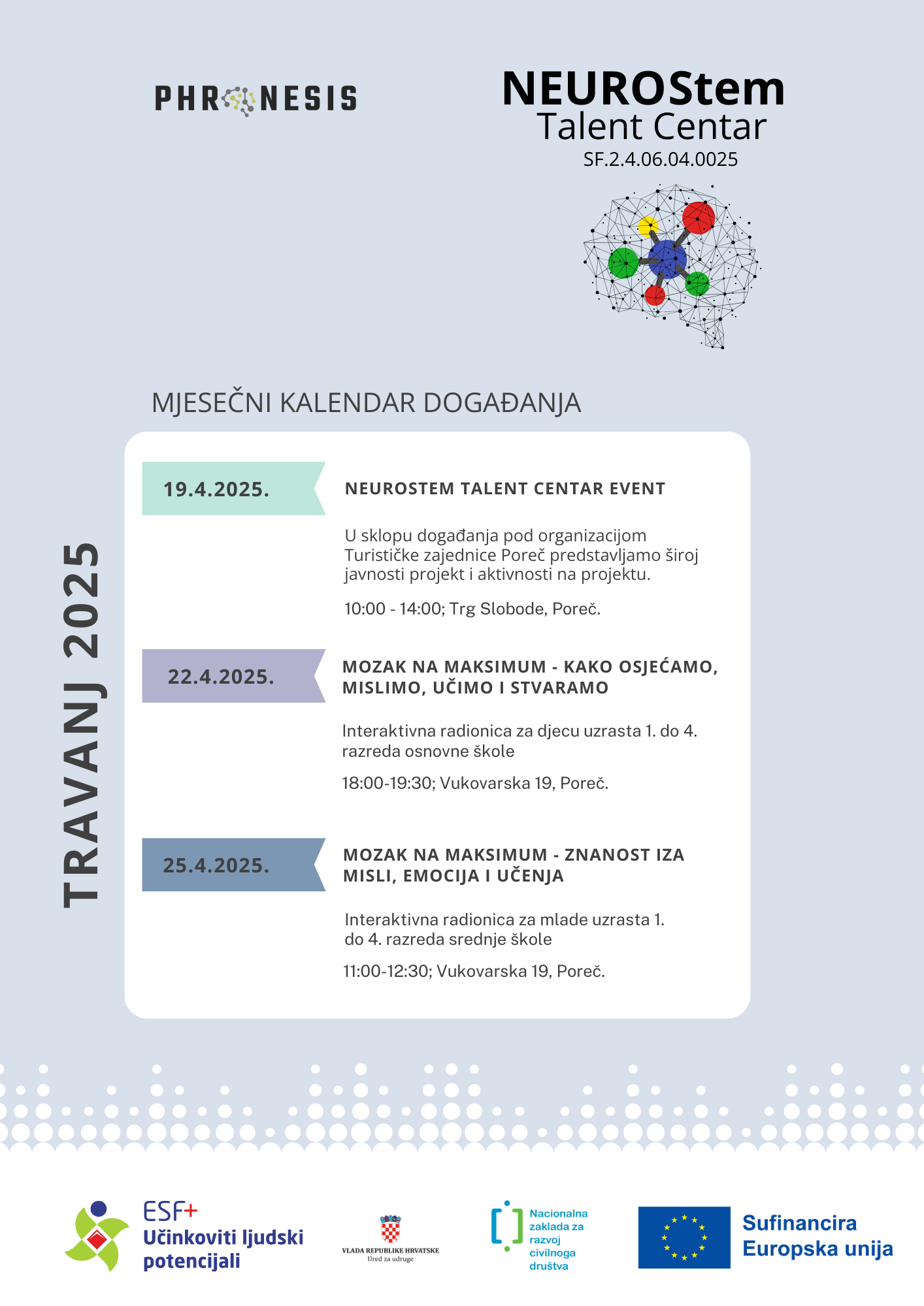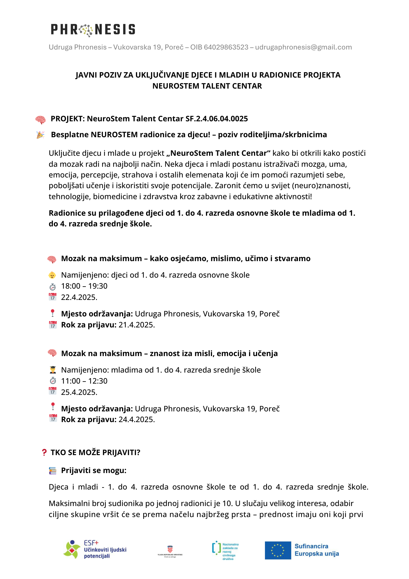 Naši partneri iz Udruge Phronesis s ponosom su započeli aktivnosti projekta NeuroStem Talent Centar, usmjerenog na razvoj potencijala djece i mladih kroz inovativne radionice o mozgu, emocijama i učenju.