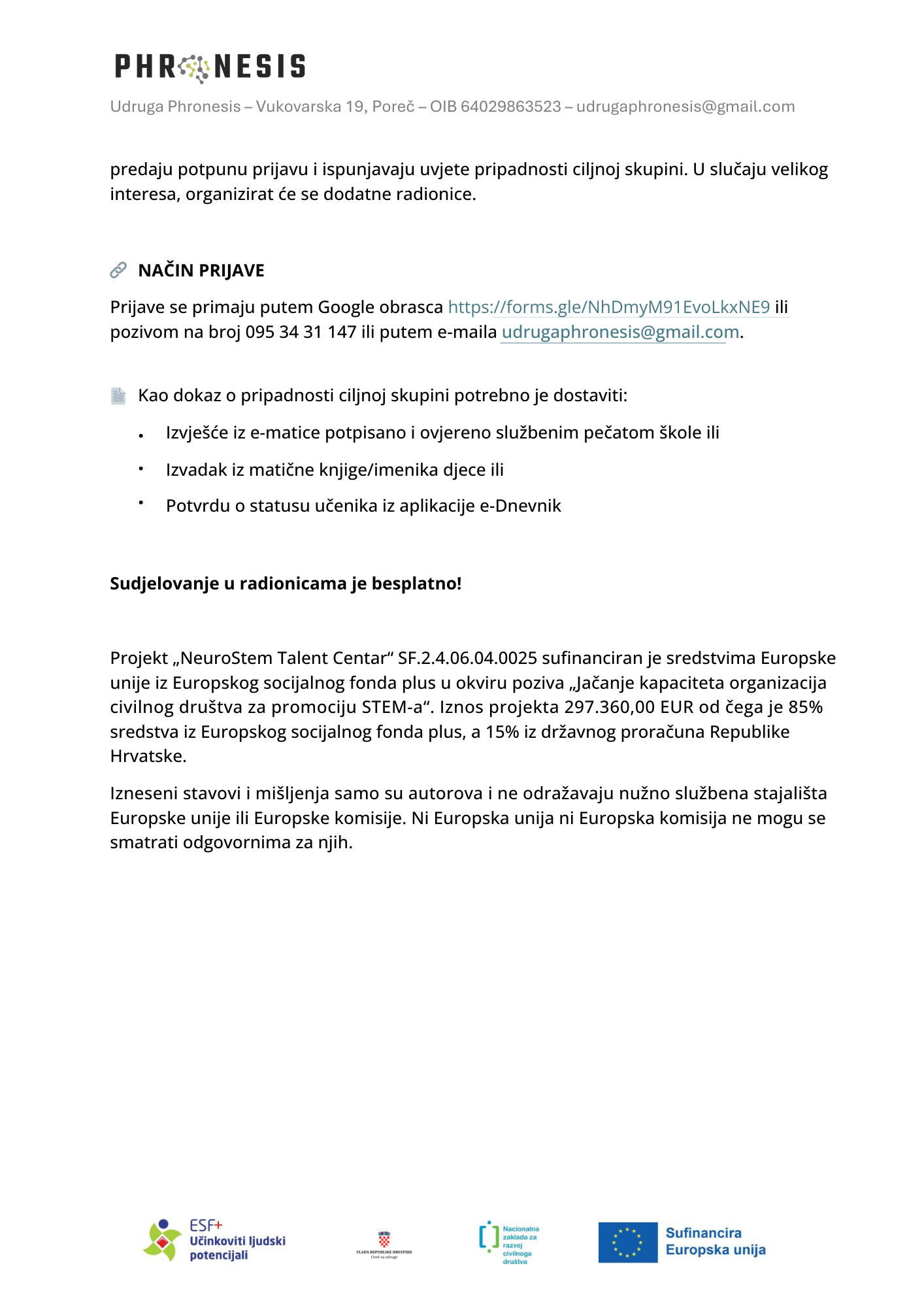 Projekt „NeuroStem Talent Centar“ SF.2.4.06.04.0025 sufinanciran je sredstvima Europske unije iz Europskog socijalnog fonda plus u okviru poziva „Jačanje kapaciteta organizacija civilnog društva za promociju STEM-a“. Iznos projekta 297.360,00 EUR od čega je 85% sredstva iz Europskog socijalnog fonda plus, a 15% iz državnog proračuna Republike Hrvatske.