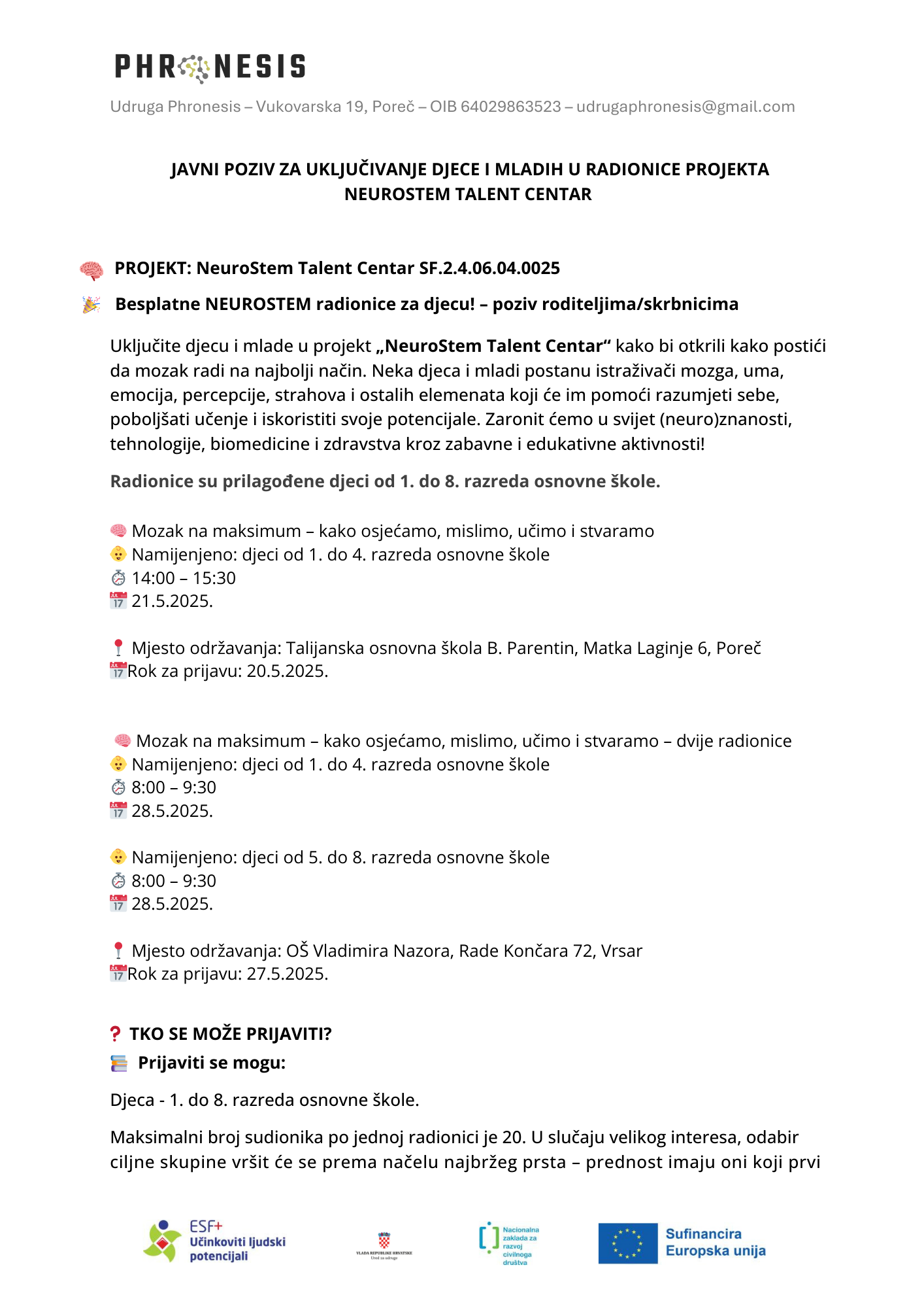 Projekt „NeuroStem Talent Centar“ SF.2.4.06.04.0025 sufinanciran je sredstvima Europske unije iz Europskog socijalnog fonda plus u okviru poziva „Jačanje kapaciteta organizacija civilnog društva za promociju STEM-a“. Iznos projekta 297.360,00 EUR od čega je 85% sredstva iz Europskog socijalnog fonda plus, a 15% iz državnog proračuna Republike Hrvatske.
