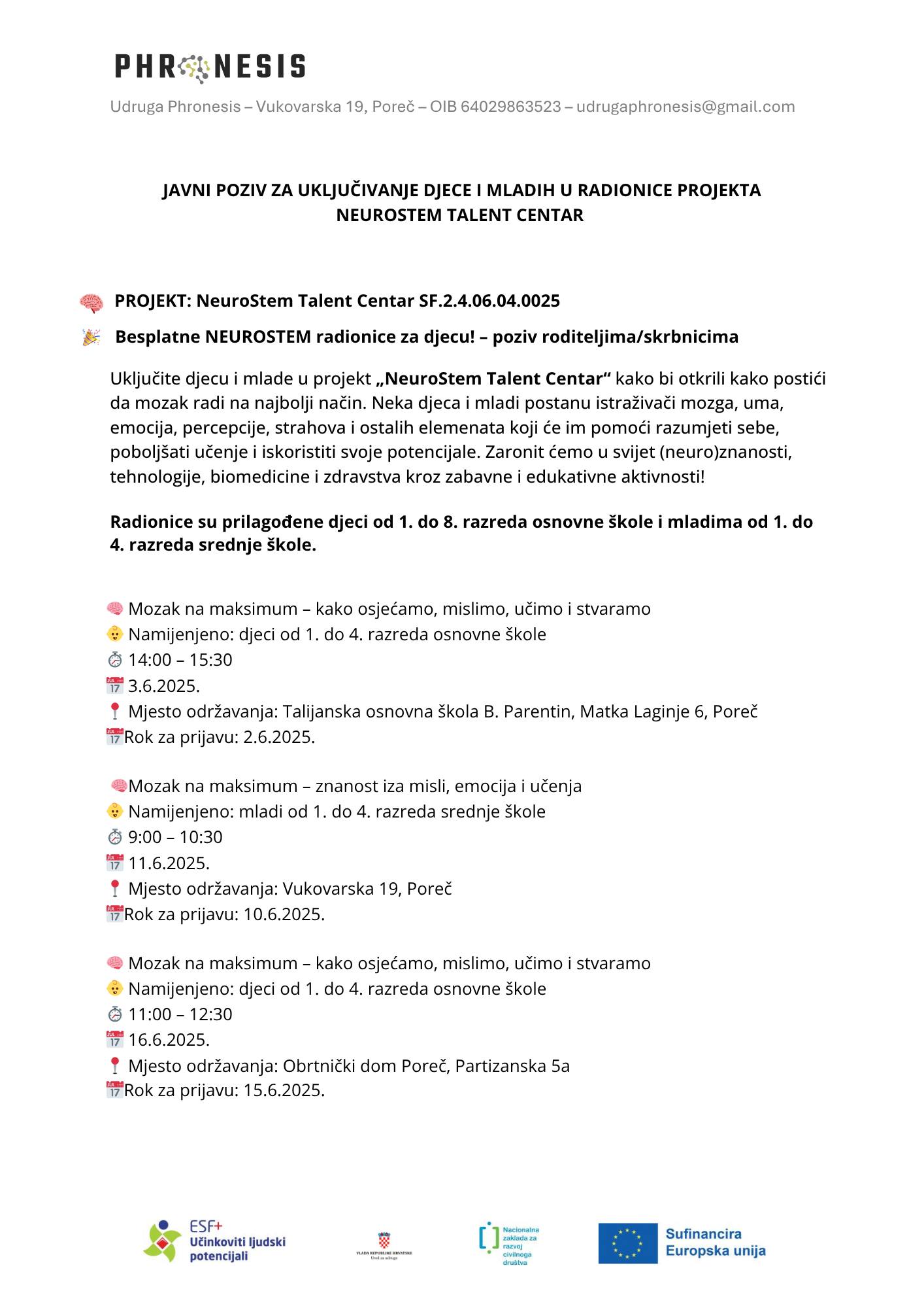 • 11. lipnja 2025. od 9:00-10:30 za mlade uzrasta od 1. do 4. razreda srednje škole (mjesto održavanja: Vukovarska 19, Poreč)