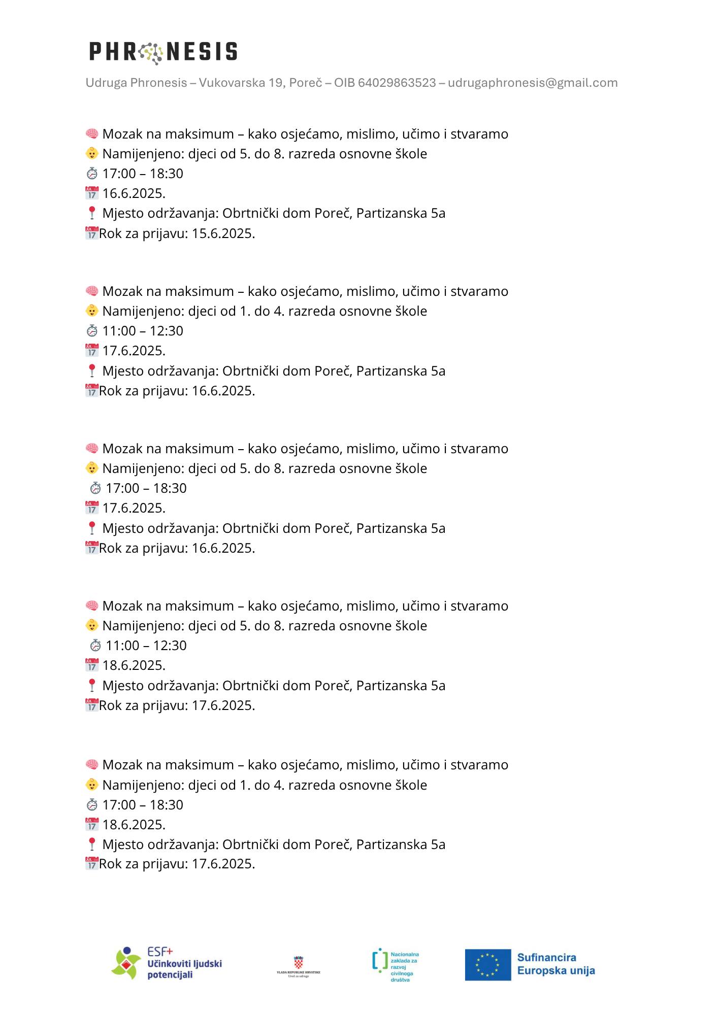 • 18. lipnja 2025. od 17:00-18:30 za djecu uzrasta od 1. do 4. razreda osnovne škole (mjesto održavanja: Obrtnički dom Poreč)