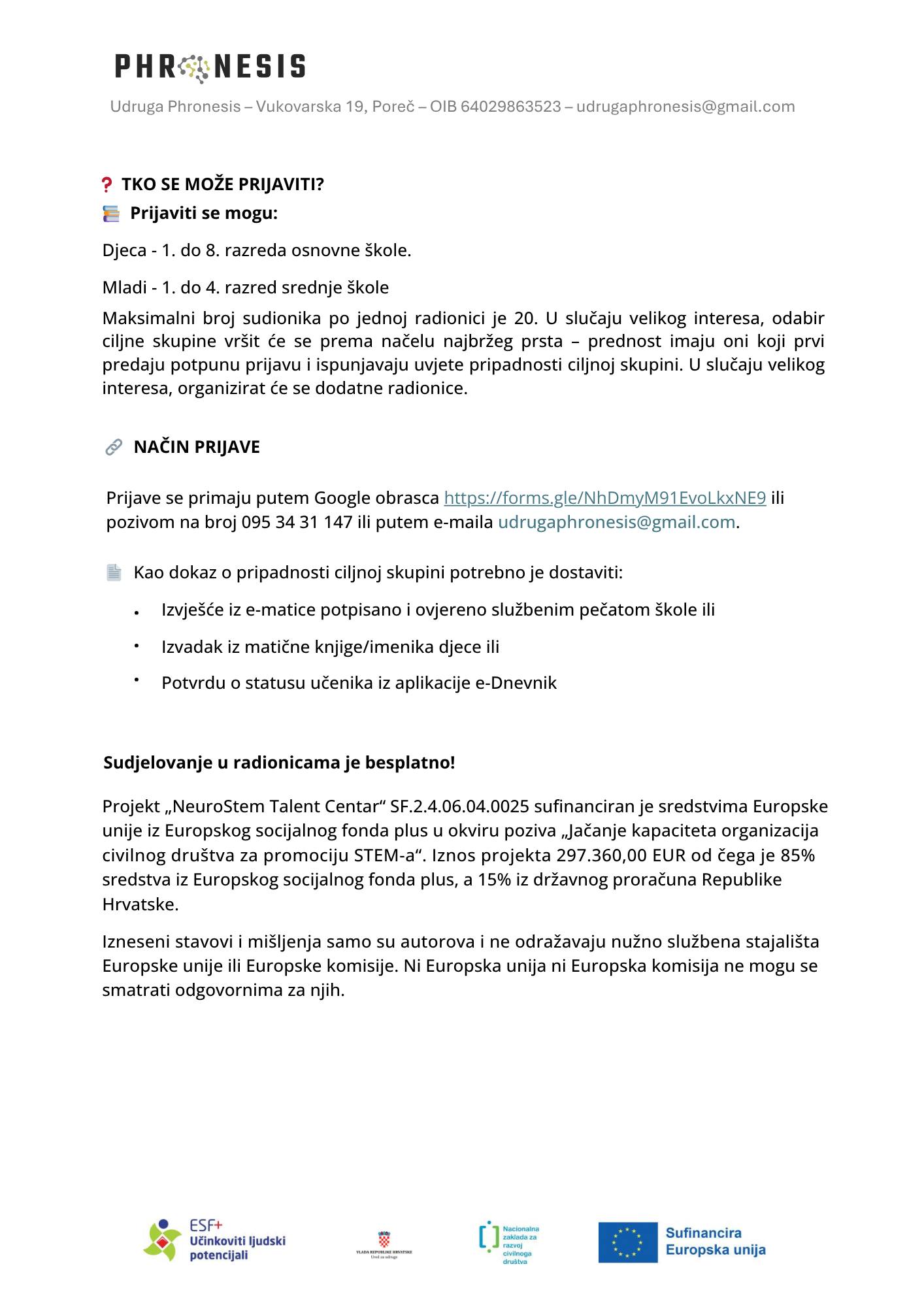 Projekt „NeuroStem Talent Centar“ SF.2.4.06.04.0025 sufinanciran je sredstvima Europske unije iz Europskog socijalnog fonda plus u okviru poziva „Jačanje kapaciteta organizacija civilnog društva za promociju STEM-a“. Iznos projekta 297.360,00 EUR od čega je 85% sredstva iz Europskog socijalnog fonda plus, a 15% iz državnog proračuna Republike Hrvatske.
