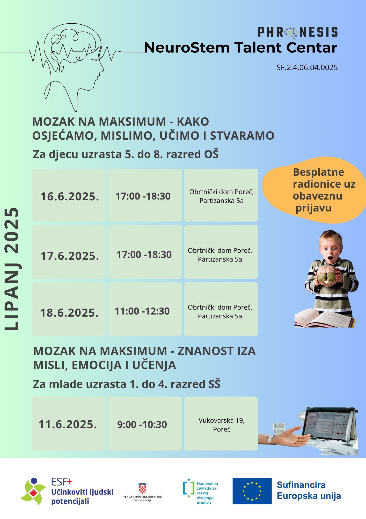 • 18. lipnja 2025. od 11:00-12:30 za djecu uzrasta od 5. do 8. razreda osnovne škole (mjesto održavanja: Obrtnički dom Poreč)