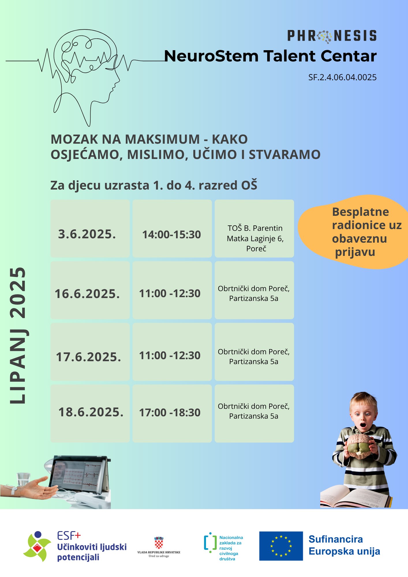 • 16. lipnja 2025. od 11:00-12:30 za djecu uzrasta od 1. do 4. razreda osnovne škole (mjesto održavanja: Obrtnički dom Poreč)