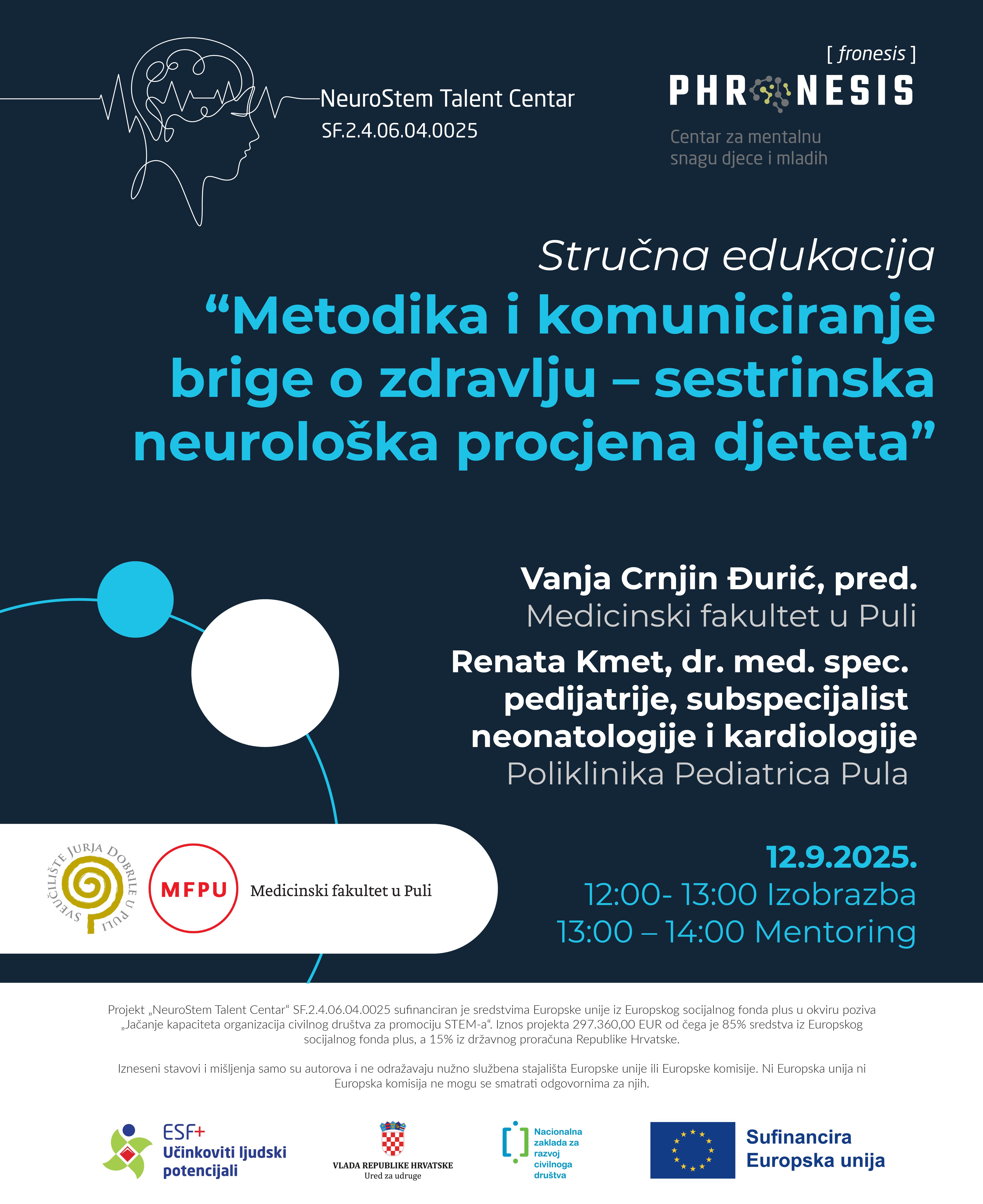 U okviru projekta NeuroStem Talent Centar održana je stručna edukacija „Metodika i komuniciranje brige o zdravlju - sestrinska neurološka procjena djeteta“ za projektne partnere koju je vodila Vanja Crnjin Đurić, pred., u suradnji s djelatnicama Poliklinike Pediatrica Pula, pedijatricama Renatom Kmet, dr. med. i Nastasjom Trifoni, dr. med.