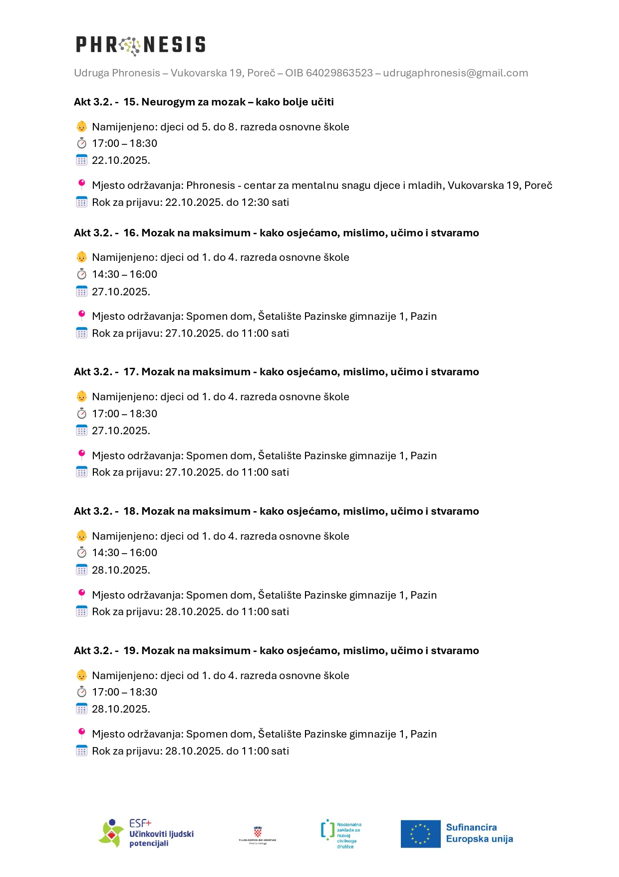 U Poreču se nastavlja popularni modul „Neurogym za mozak: uči pametnije!“ namijenjen osnovnoškolcima. Modul se sastoji od tri međusobno povezane radionice. U radionici „Programiraj svoj mozak za učenje“ djeca kroz igre uloga i eksperimente uče što olakšava, a što otežava pamćenje i učenje. Radionica „Naučimo kako bolje učiti“ vodi ih kroz različite tehnike i strategije kako bi otkrili one koje im najbolje odgovaraju. U radionici „Može li mozak bez ekrana?“ potiču se na kritičko promišljanje o utjecaju tehnologije na pažnju, emocije i san te razvijaju zdravije digitalne navike.