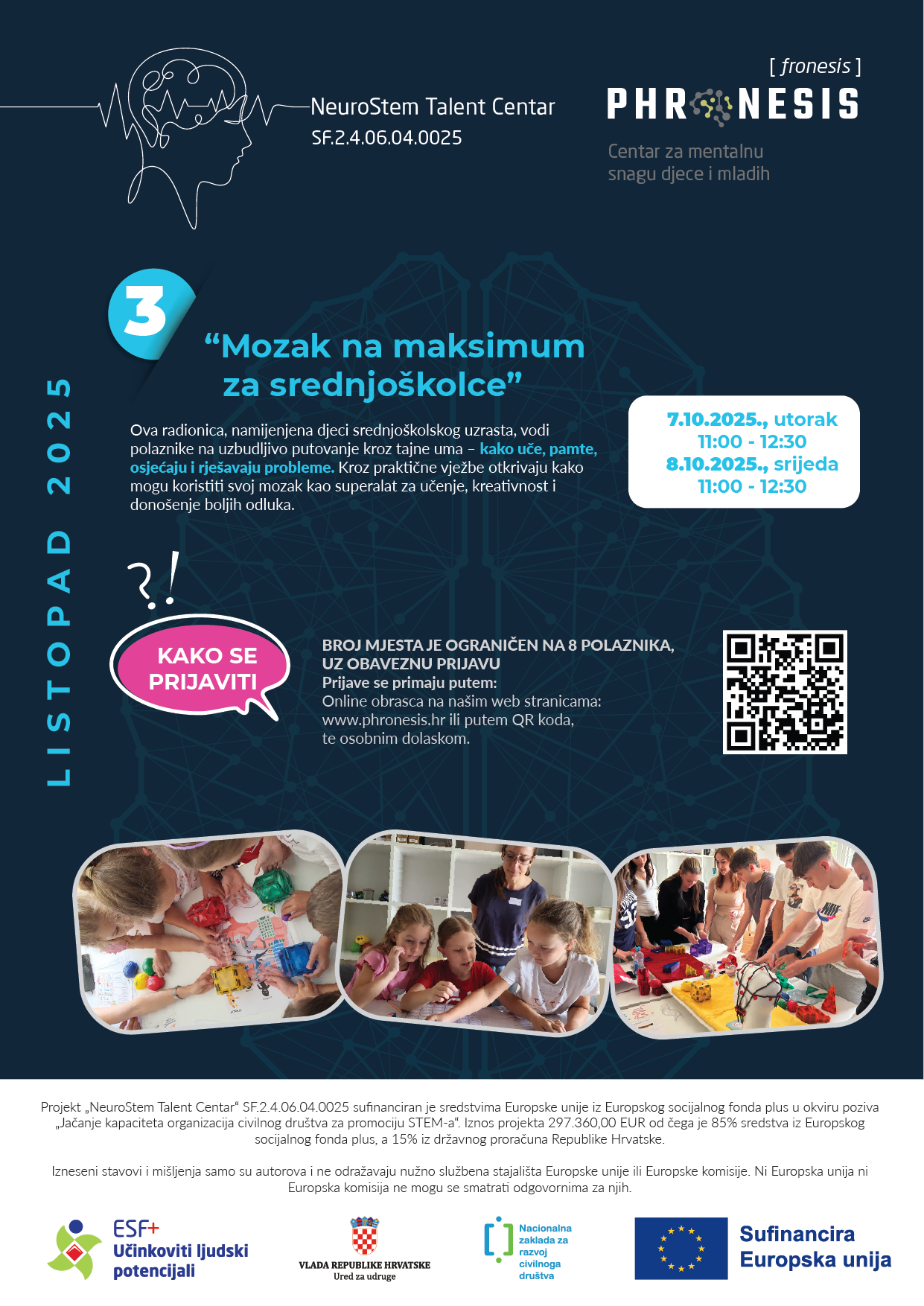 Za srednjoškolce se nastavlja modul “Mozak na maksimum”, koji polaznike vodi na uzbudljivo putovanje kroz tajne uma. Mladi uče kako njihov mozak funkcionira u procesima učenja, pamćenja i donošenja odluka te kroz STEM pristupe razvijaju kritičko razmišljanje te kroz praktične vježbe otkrivaju kako ga mogu koristiti kao „superalat“ za razvoj kreativnosti, bolje upravljanje emocijama i učinkovitije rješavanje problema.