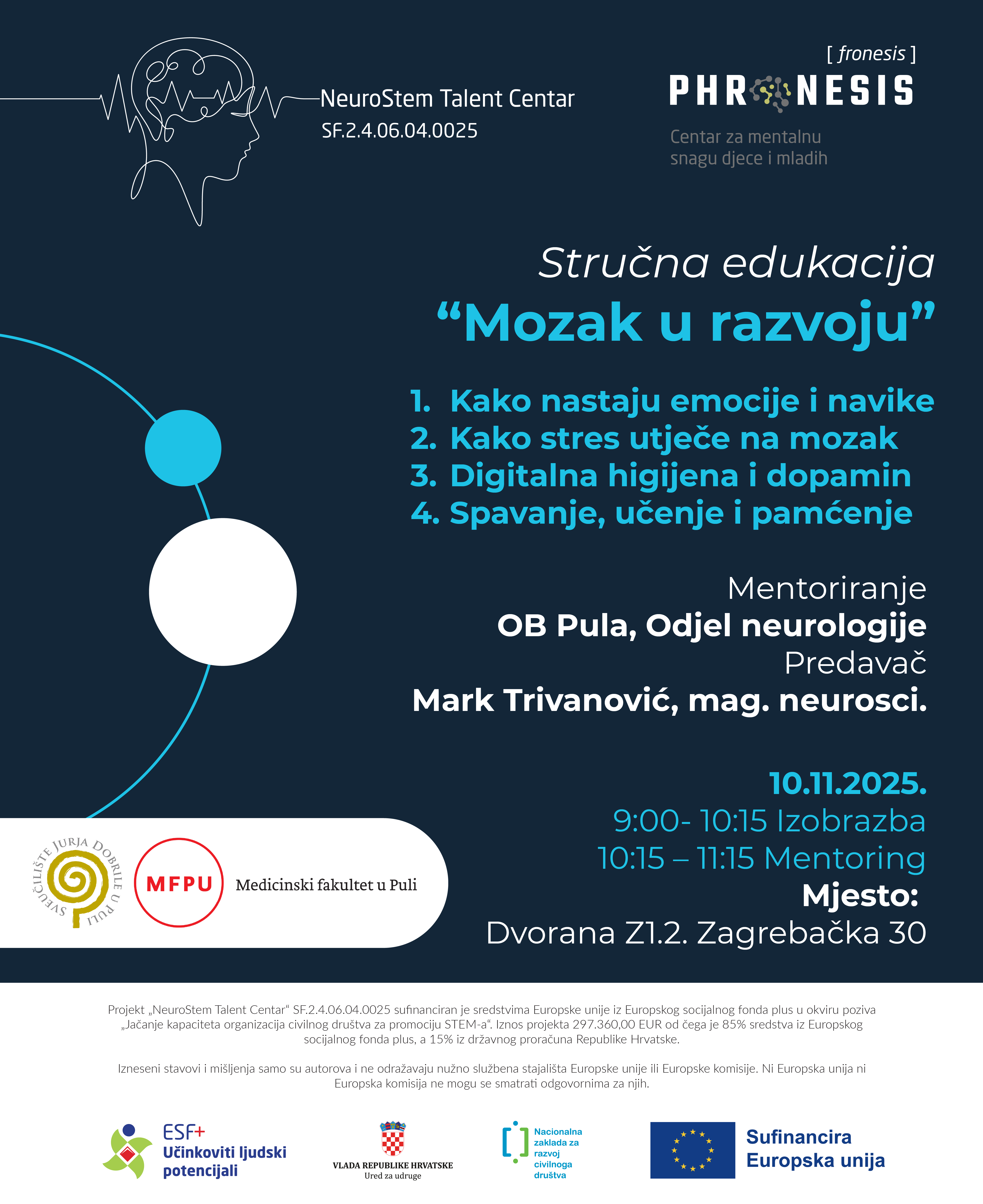 U sklopu projekta NeuroStem Talent Centar 10. studenoga 2025. u 09:00 sati održat će se stručno predavanje pod nazivom „Mozak u razvoju“, koje će voditi Mark Trivanović, mag. neurosci. Predavanje će ponuditi uvid u složene procese razvoja dječjeg mozga od nastanka emocija i navika do utjecaja stresa, digitalnih navika i spavanja na učenje i pamćenje.