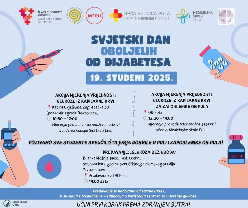 Medicinski fakultet u Puli u suradnji s Istarskim domovima zdravlja, Općom bolnicom Pula, Medicinskom školom Pula i Hrvatskom komorom medicinskih sestara organizira obilježavanje Svjetskog dana oboljelih od dijabetesa.