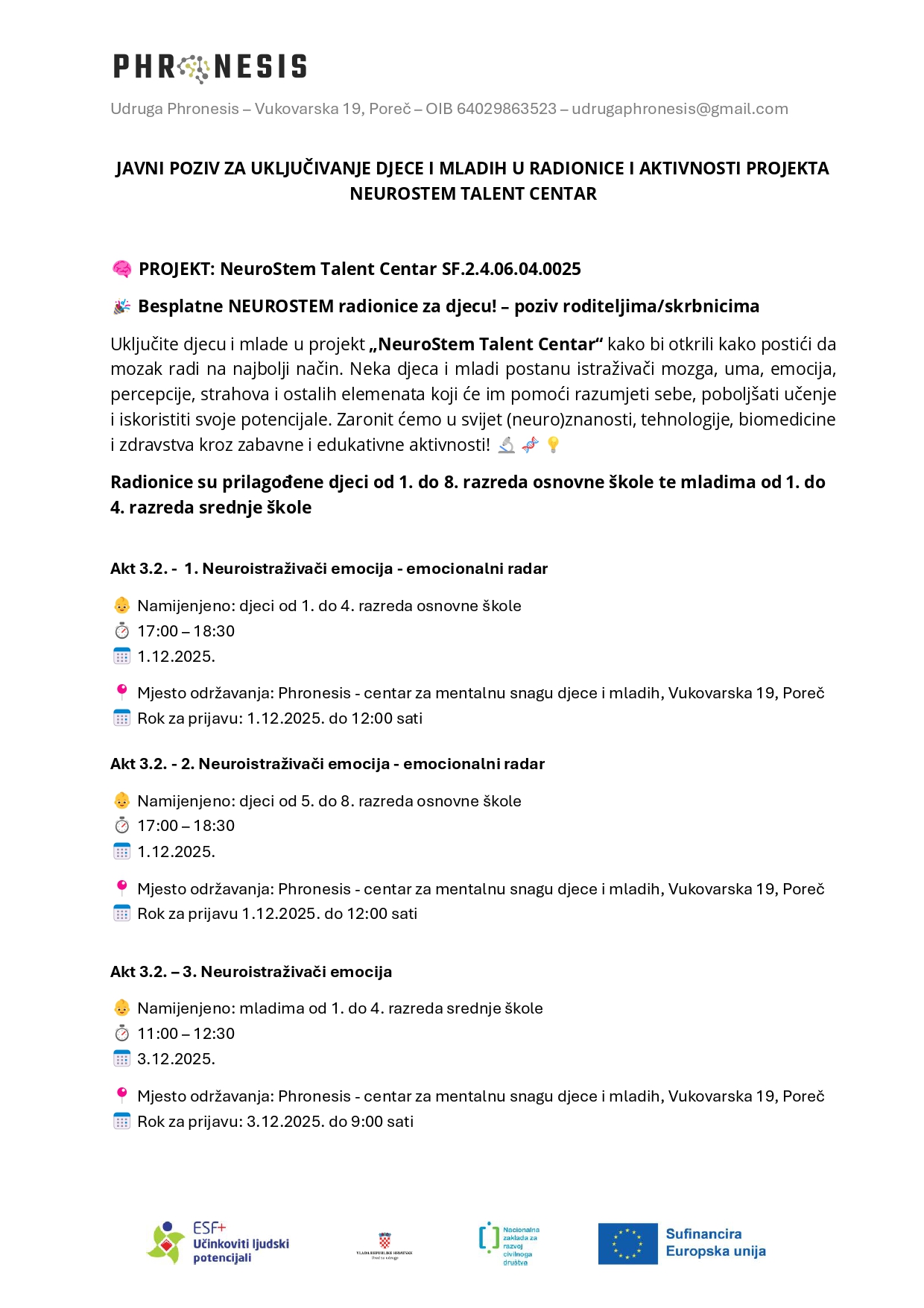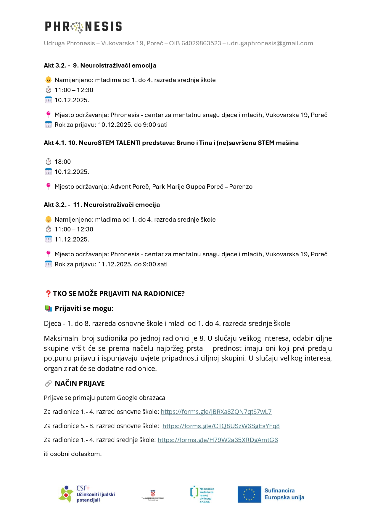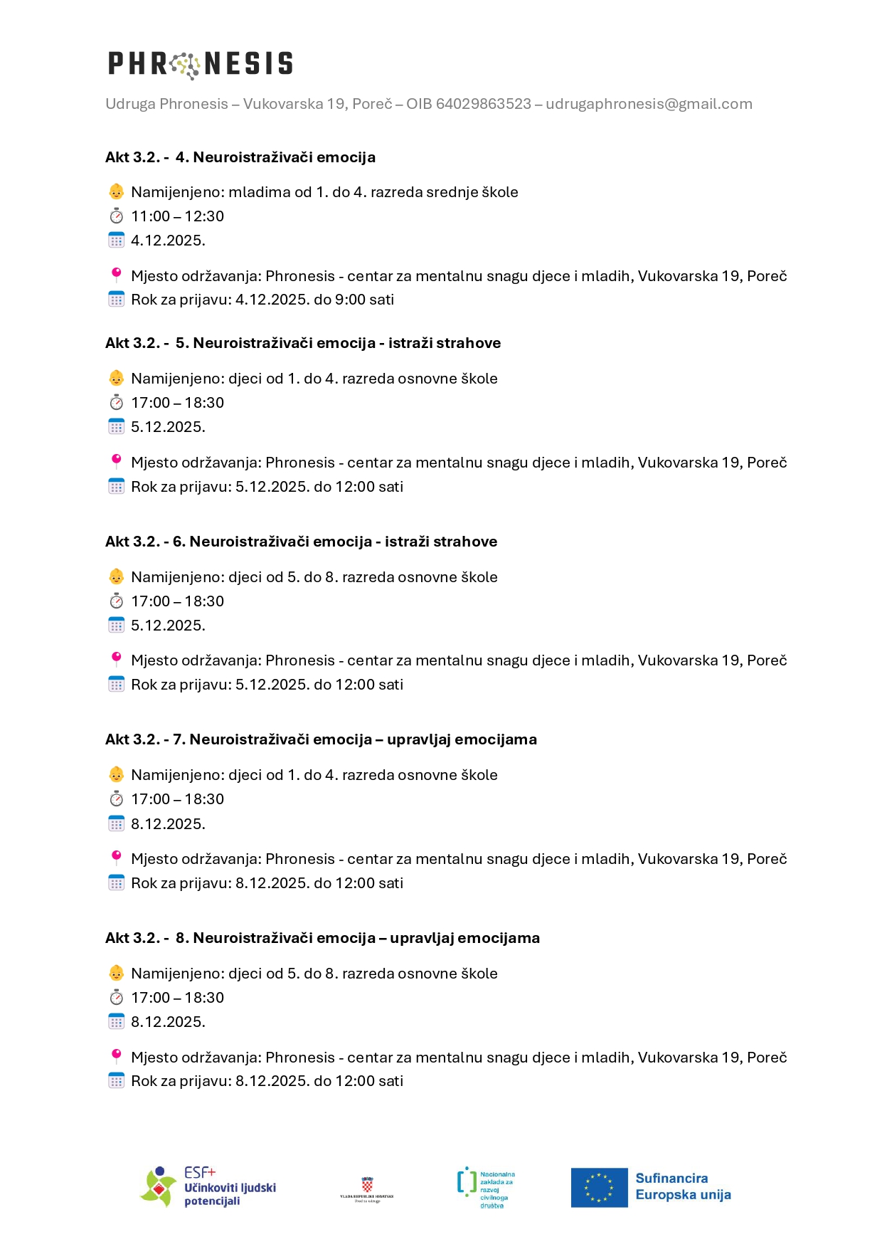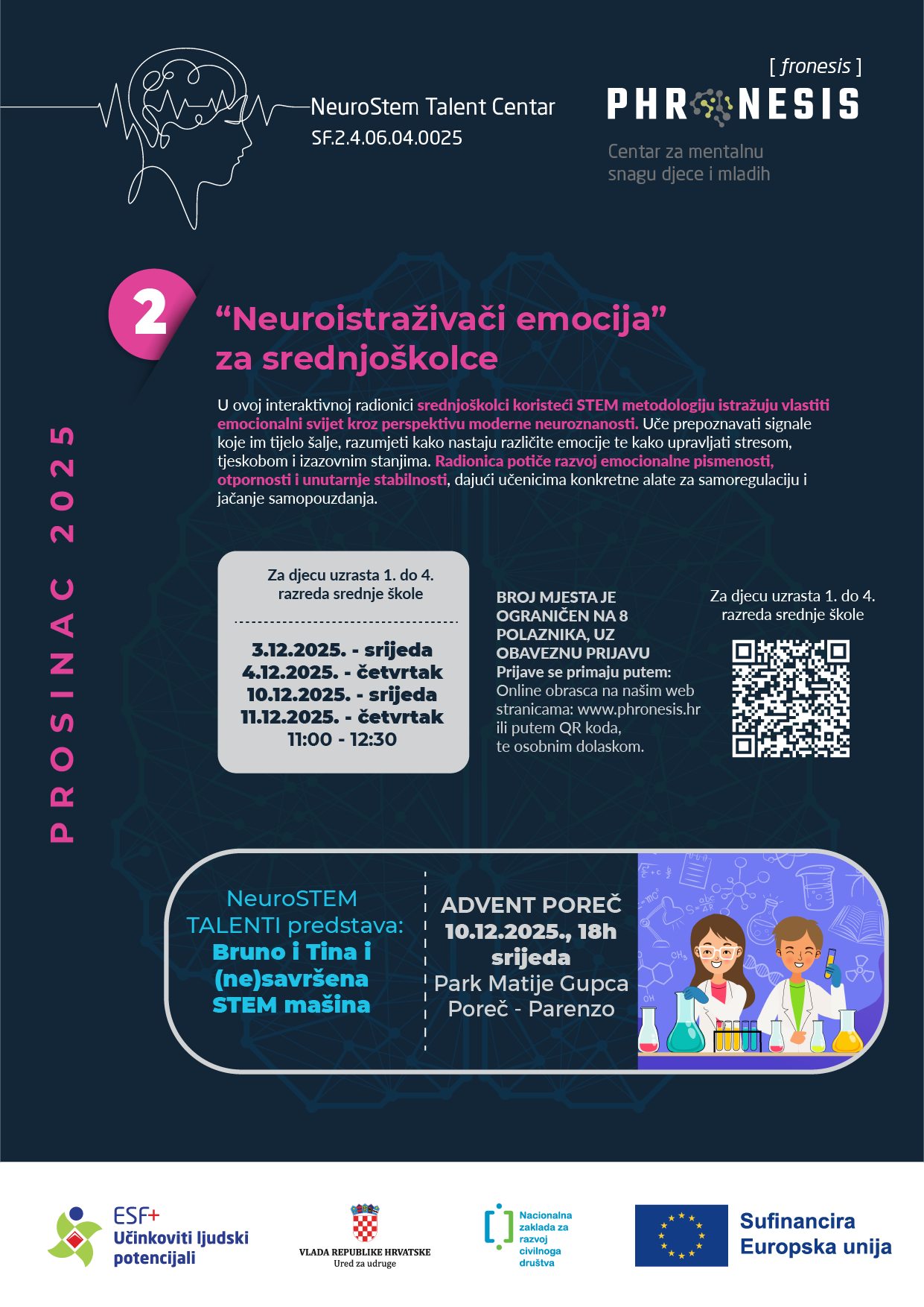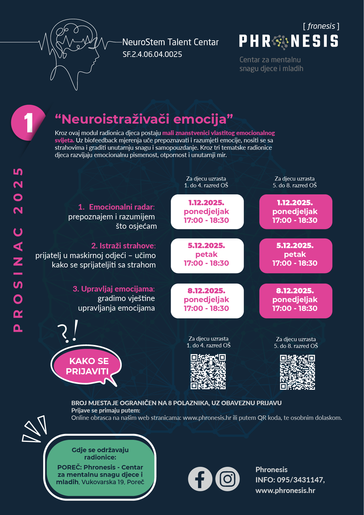 Radionice “Neuroistraživači emocija” za djecu od 1. do 8. razreda održavaju se 1., 5. i 8. prosinca od 17:00 do 18:30, uz paralelne grupe za učenike 1.–4. te 5.–8. razreda, s maksimalno osam polaznika po grupi.