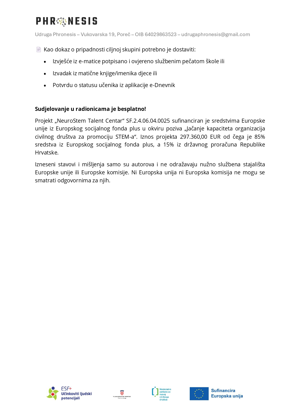 Projekt „NeuroStem Talent Centar“ SF.2.4.06.04.0025 sufinanciran je sredstvima Europske unije iz Europskog socijalnog fonda plus u okviru poziva „Jačanje kapaciteta organizacija civilnog društva za promociju STEM-a“. Iznos projekta 297.360,00 EUR od čega je 85% sredstva iz Europskog socijalnog fonda plus, a 15% iz državnog proračuna Republike Hrvatske.