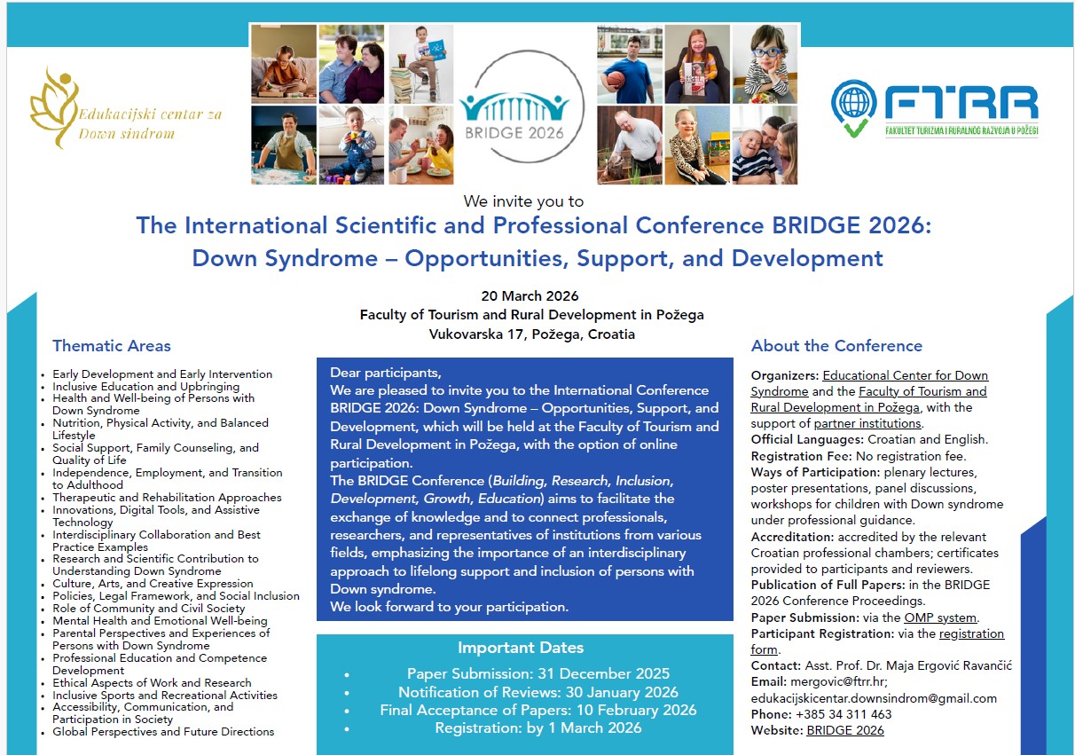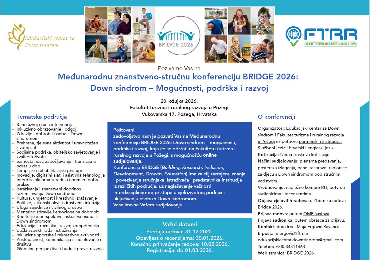 zadovoljstvo nam je pozvati Vas na Međunarodnu znanstveno-stručnu konferenciju BRIDGE 2026: Down sindrom – mogućnosti, podrška i razvoj, koja će se održati na Fakultetu turizma i ruralnog razvoja u Požegi dana 20. ožujka 2026., uz mogućnost online sudjelovanja.